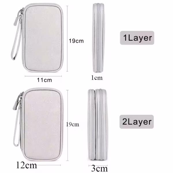 The electronics storage bag has 2 layers interior compartment with enough space to take in your cords, cables, USB drive, cellphone, charger, mouse, flash drive, and other accessories.